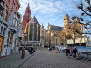 De stad is vorig jaar Rotterdam voorbij gestreefd. Na de Stokstraat liepen wij naar het Onze Lievevrouwenplein. Het plein was sfeervol aangekleed en de meeste zitplaatsen waren al bezet door mensen de genoten van een drankje en of wat te eten. Natuurlijk werd de Mariakapel, nadat onze gids enkele bijzonderheden over het beeld verteld had, bezocht en er werden kaarsjes aangestoken. Daarna via de Koestraat naar het Jekerkwartier. Lang de in werking zijnde bisschopsmolen, welke o.a. eigendom is geweest van de bisschop van Luik, langs de Minderbroederskerk naar de Helpoort met het Pater Vinktorentje.